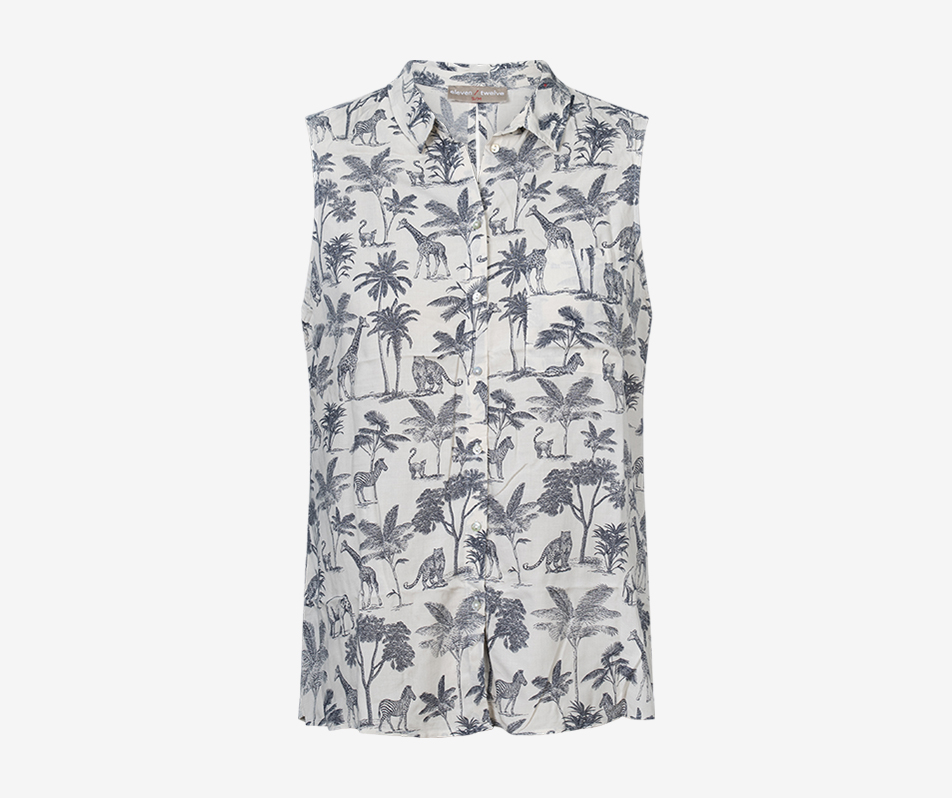 Casual flowy sleeveless button down shirt with a blue jungle print. The soft lightweight fabric is perfect for hot summer days, or layer with a blazer or coat for a smart evening l…