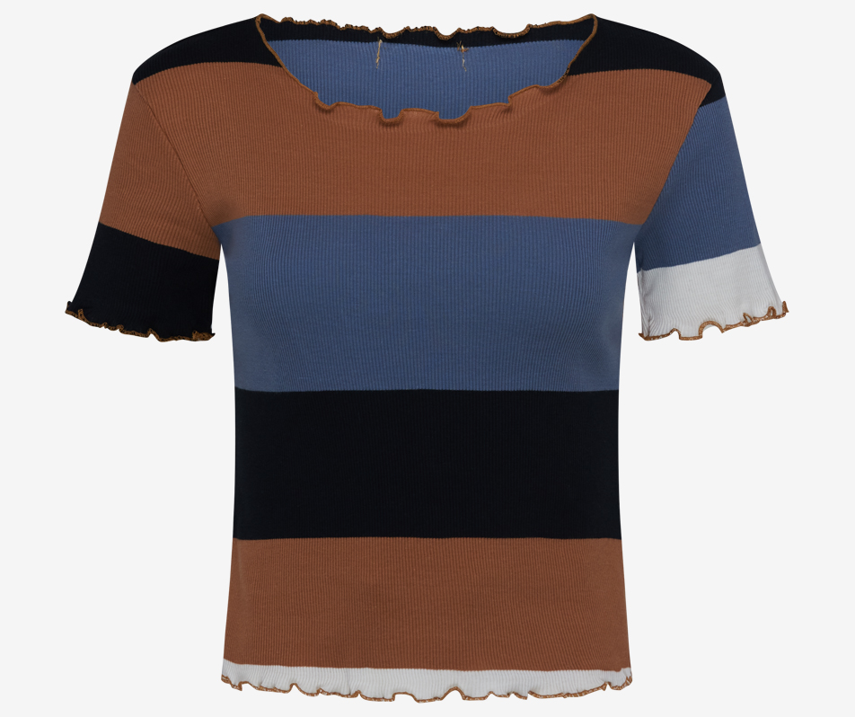 The Block Stripe print Lettuce Neck in Brown/Blue is a new-season take on a fun wardrobe staple. The simple t-shirt silhouette is combined with a ribbed jersey fabrication and lett…