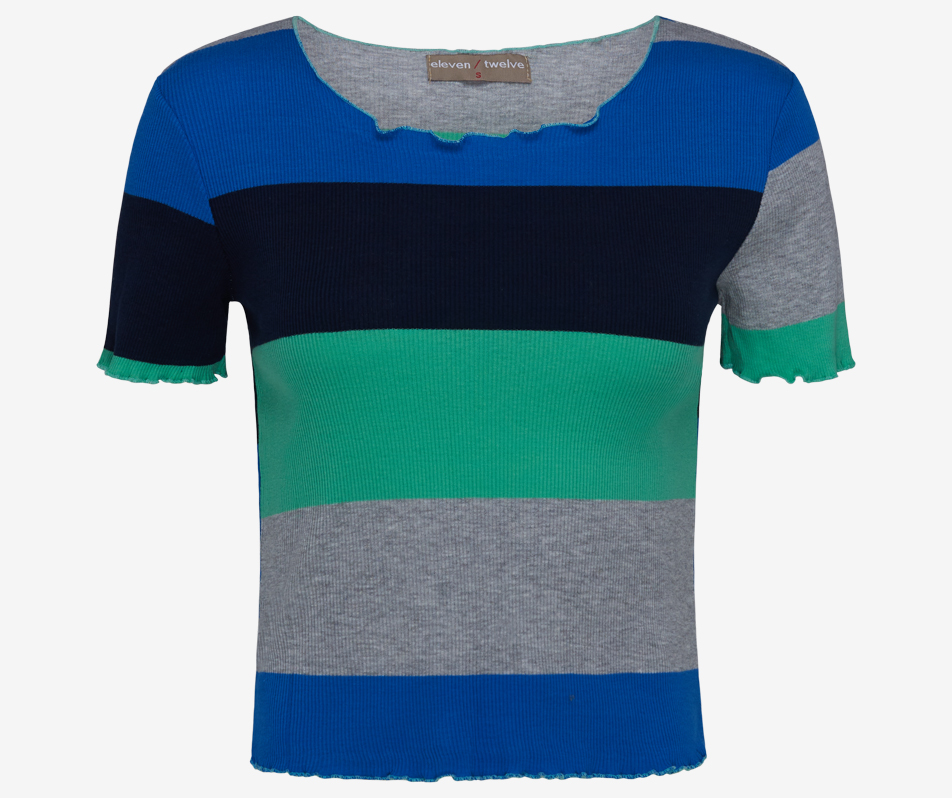 The Block Stripe print Lettuce Neck in Green/Gray is a new-season take on a fun wardrobe staple. The simple t-shirt silhouette is combined with a ribbed jersey fabrication and lett…