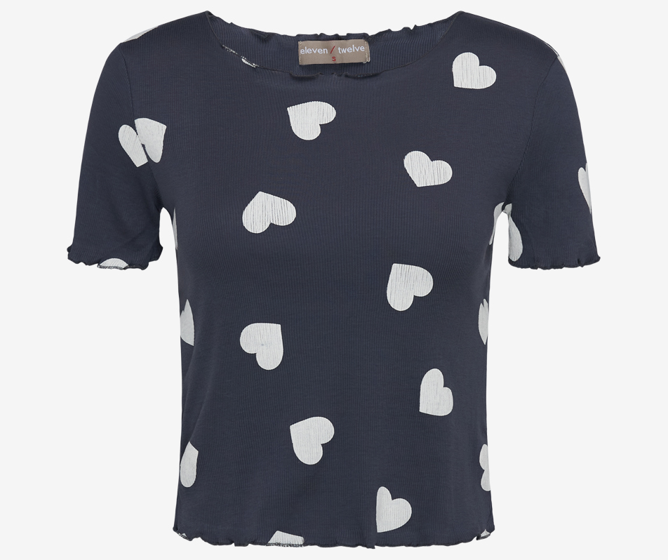 The Heart print Lettuce Neck in Navy is a new-season take on a fun wardrobe staple. The simple t-shirt silhouette is combined with a ribbed jersey fabrication and lettuce-edge trim…