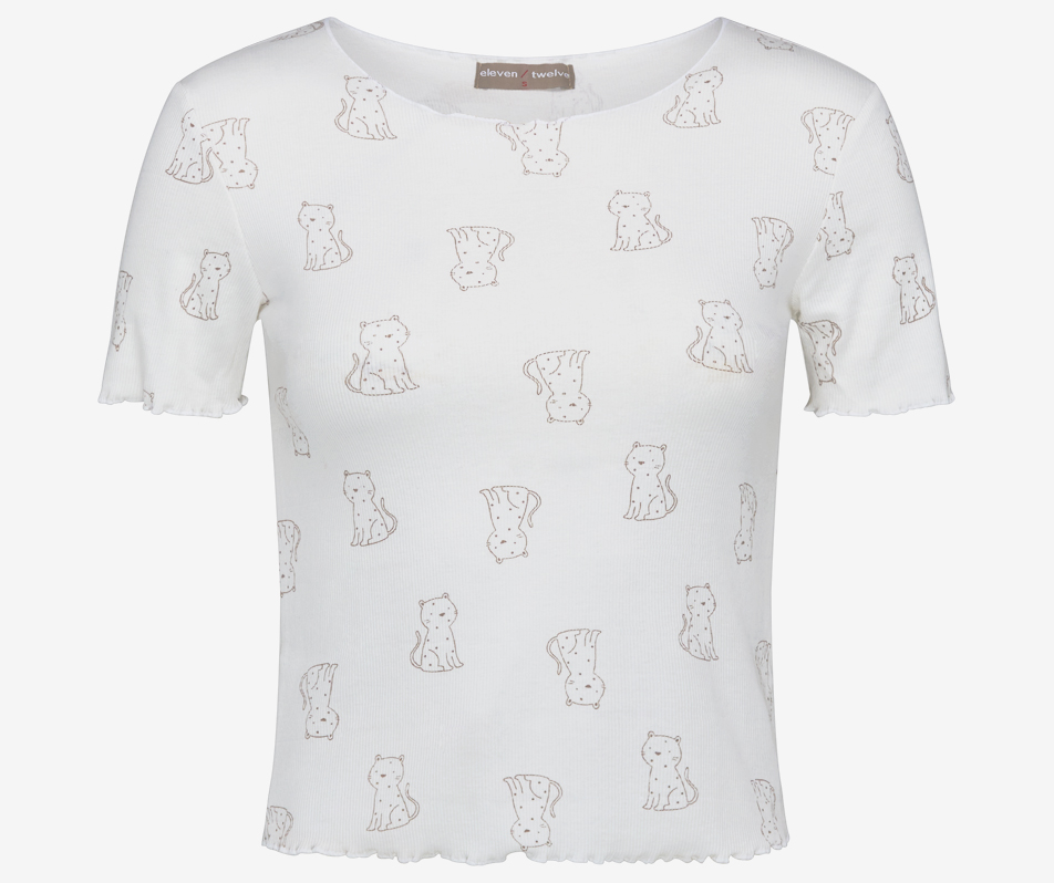 The Kitten print Lettuce Neck in white is a new-season take on a fun wardrobe staple. The simple t-shirt silhouette is combined with a ribbed jersey fabrication and lettuce-edge tr…