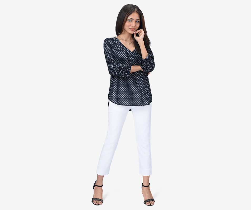 Feel sleek in this blouse top with its sharp V-neckline, long sleeves and pattern print. Model is 5’1” and is wearing S size