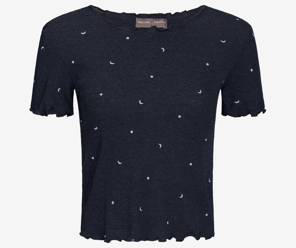The Moon/Crescent print Lettuce Neck is a new-season take on a fun wardrobe staple. The simple t-shirt silhouette is combined with a ribbed jersey fabrication and lettuce-edge trim…