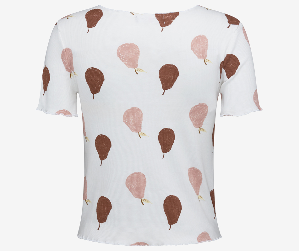 The Pear print Lettuce Neck in white is a new-season take on a fun wardrobe staple. The simple t-shirt silhouette is combined with a ribbed jersey fabrication and lettuce-edge trim…