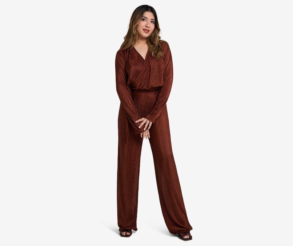 Elevate your style with this versatile ensemble that seamlessly transitions from casual brunches to evening soirées. Get ready to turn heads with this stunning brown Plisse duo!
