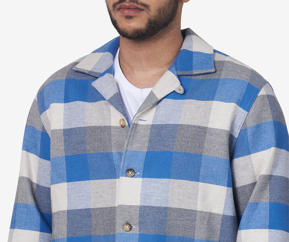 This heavy duty Shacket comes in a sky blue and soft grey large checked fabrication, with twist on the collar with a cuban look, showing a cool hue with a warm feeling. Made with 1…