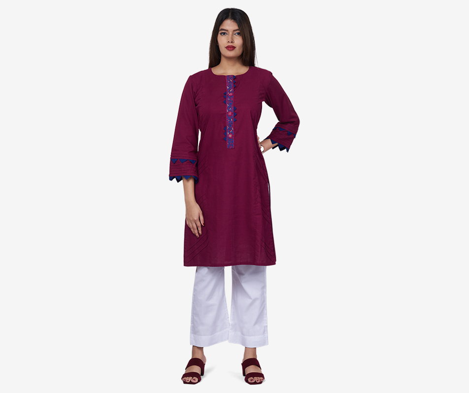 A plum red kurti with round neck line and berry blue teeth detail work on sleeves and body. Perfect choice to stay warm and fabulous this winter season. Fabric: Remi cotton