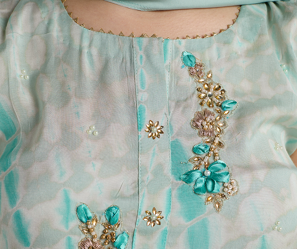 A Blue cotton candy, tie dye kurti with hand embroidered floral zari kat chuppi details and zig zag lace work around the neck. Comes with matching dupatta, salwar and extra sleeves…