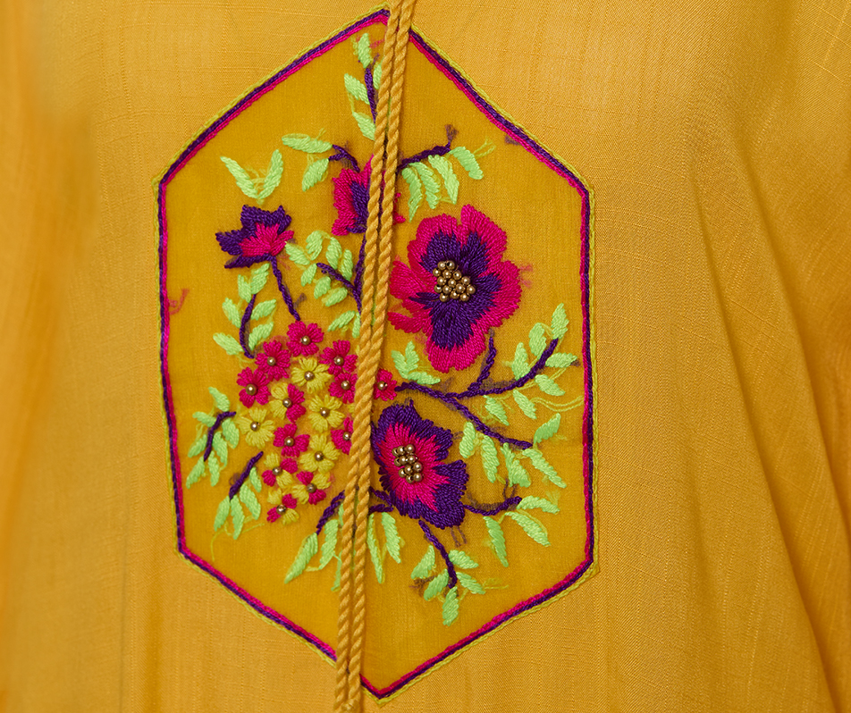 A bright yellow tunic with hand embroidered colourful floral work and tassel tie around the neck. Perfect for the festive season. Fabric- Georgette