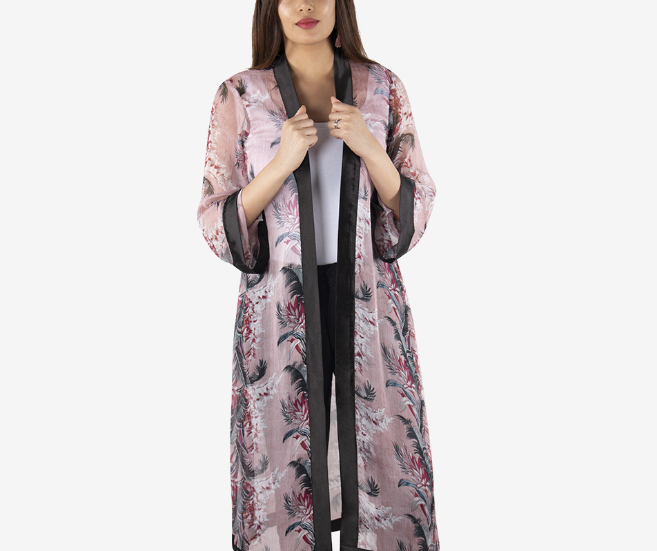 A versatile, Japanese inspired, sheer robe in a subdued mauve colour theme with a classic satin black border. Pair it with any monochrome combinations of pants, shorts, skirts and …