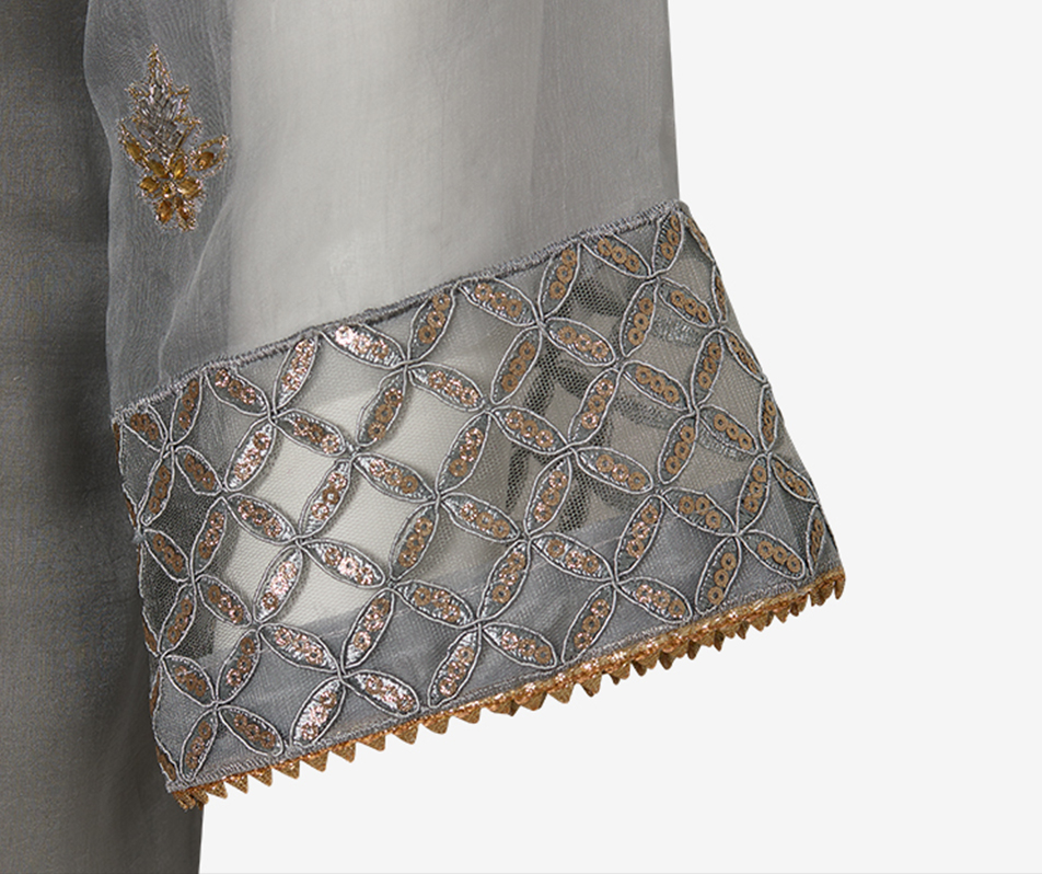 A classic sober grey, v- neck kurti, hand embroidered with zari kat chuppi florals stone work and lace on the sleeves. Comes with matching salwar and dupatta. A glam yet simple pie…