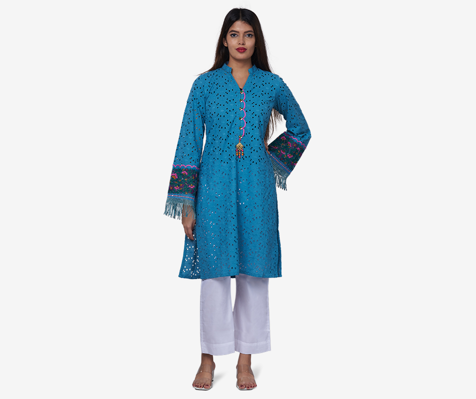 A teal blue kurti in chikan cotton. Bright colourful embroidery work and tassel details on the sleeves and buttons. Fabric: chikan cotton