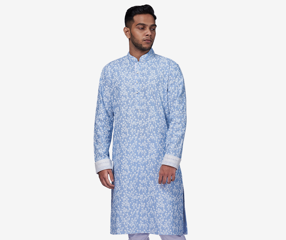 Stay on trend this season with the cloud blue floral panjabi designed with an embroidered lace cuff to elevate your look. Feel fresh and afloat for your daytime outings with this p…