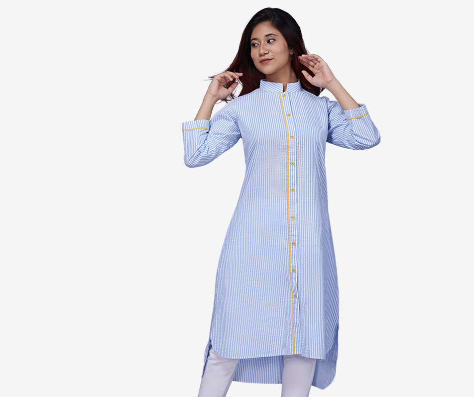 An effortless choice that transcends seasons, the blue striped dress is crafted from breathable cotton seersucker fabric. The blue striped dress creates a smart look with a mandari…