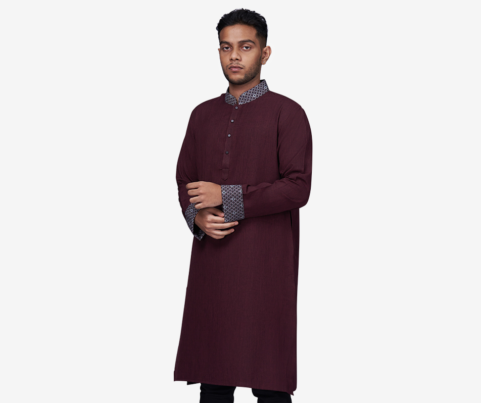 Make a bold statement with this soft burgundy panjabi complemented with a geomtetric accents. Perfect to wear for your evening occasions, this piece is elegantly brought together w…