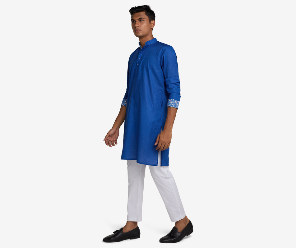 The Cobal Blue Floral Panjabi is a true testament to contemporary elegance. It comes in a royal cobalt blue with a subtle all over jacquard pattern, combined with complimenting flo…