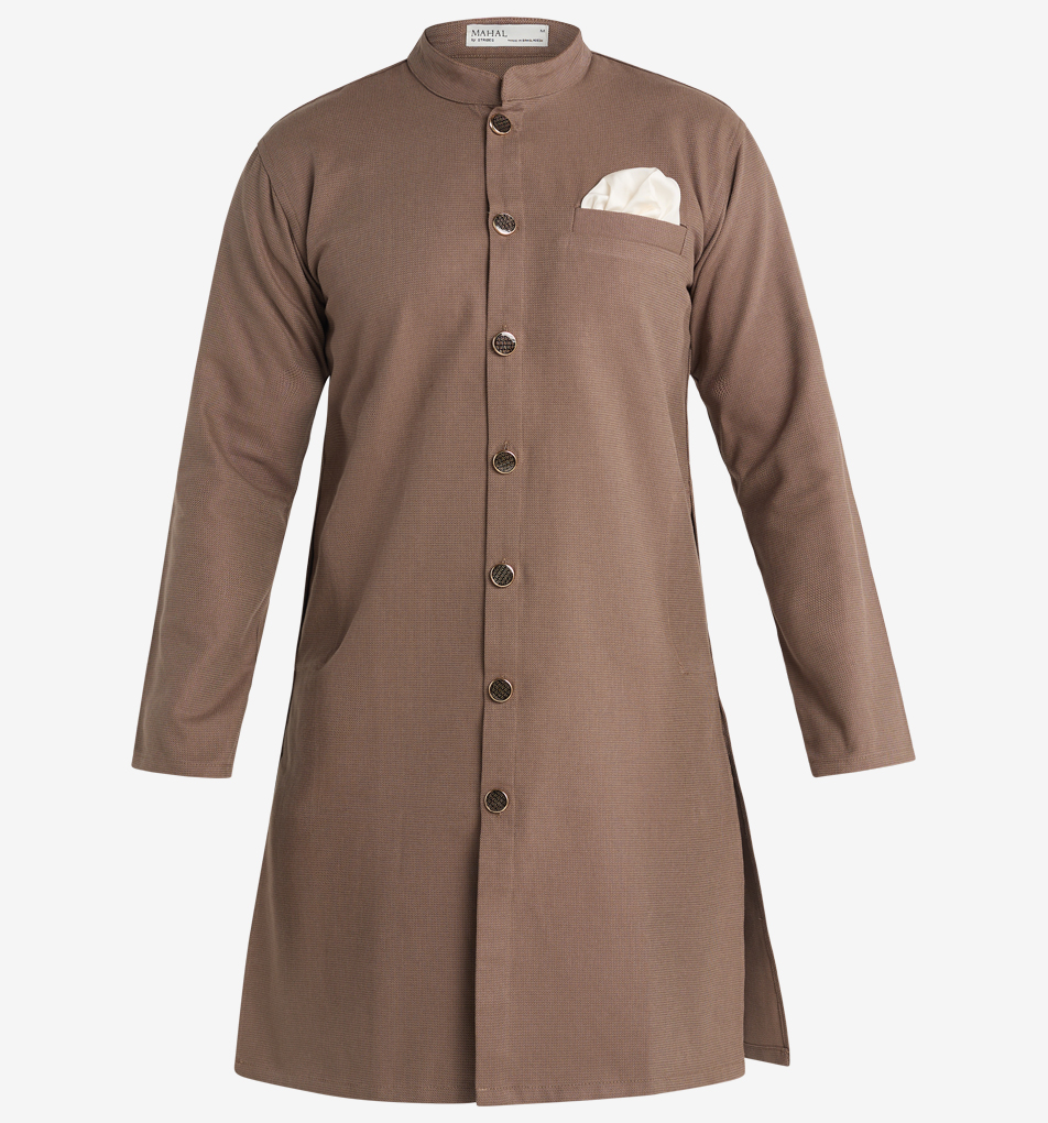 Step into regal refinement with the MAHAL Coffee Bean Sherwani Panjabi—a unique and trend-setting hue that captivates. Crafted from luxurious 100% Premium Cotton, this subtle textu…
