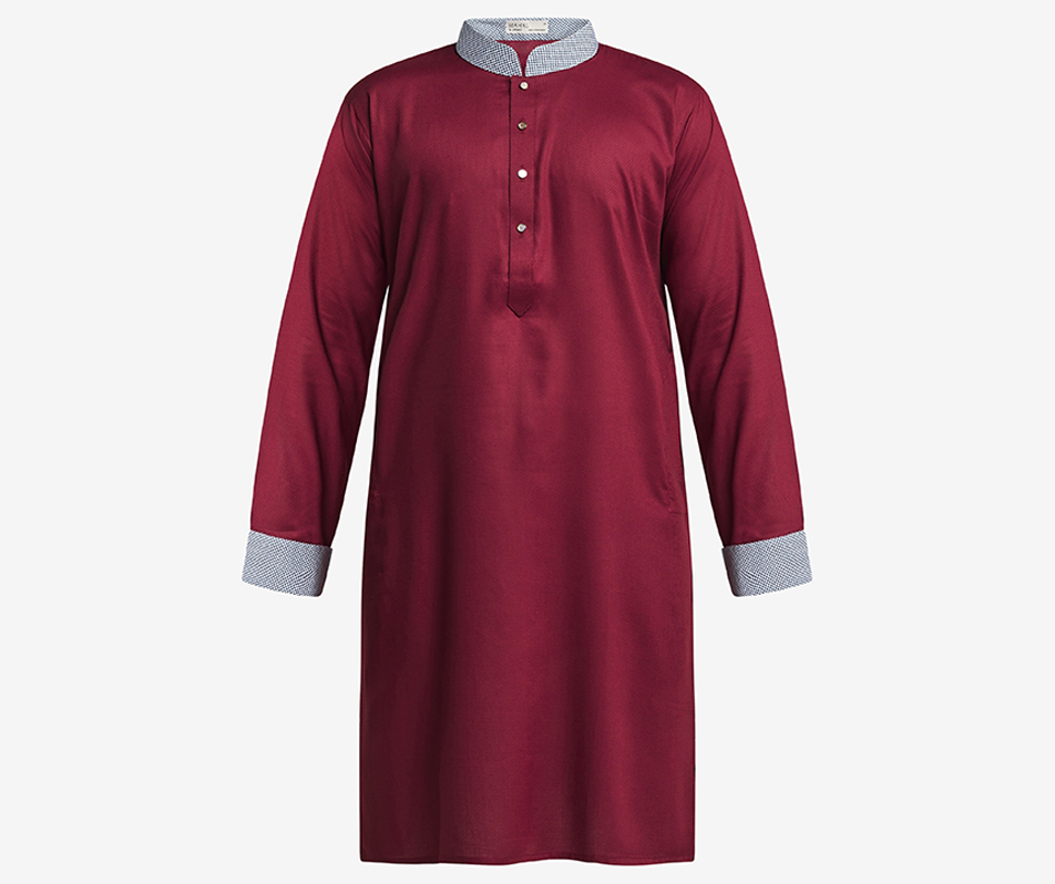 As striking as they come, the Crimson Panjabi embodies power and is brought to humbleness with the gentlemanly navy Houndstooth Pattern, found on the cuff of the panjabi and from t…
