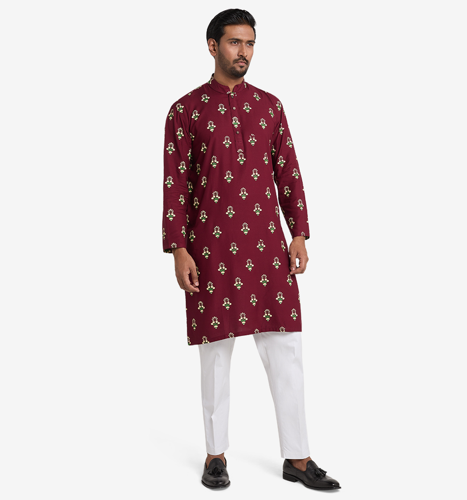 Introducing the embodiment of festive flair and modern elegance - the MAHAL Aster Flora Ruby Printed Panjabi. A celebration of originality and contemporary charm, this exquisite cr…