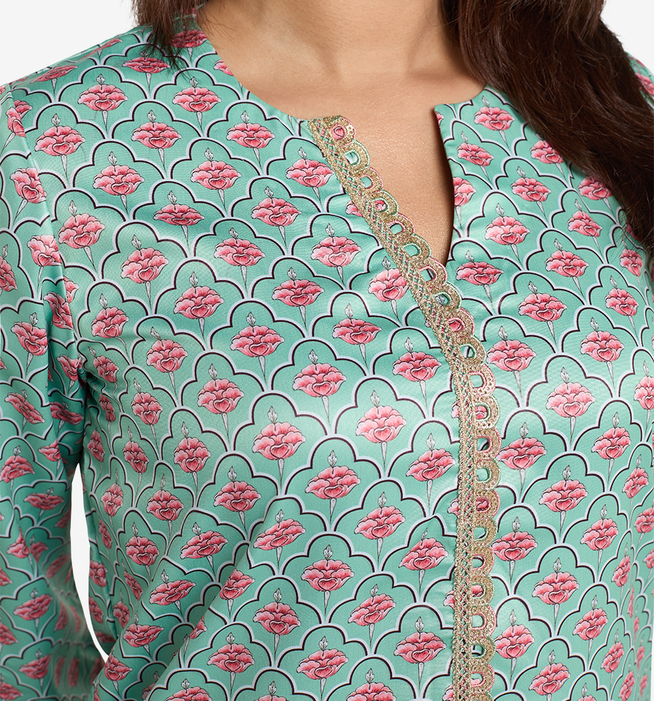 Description: Unleash your inner trendsetter with MAHAL's Exclusive Lotus Meadow Kurti & Pant Set in Seafoam Green! This chic co-ord features a mesmerizing digital print of vibr…