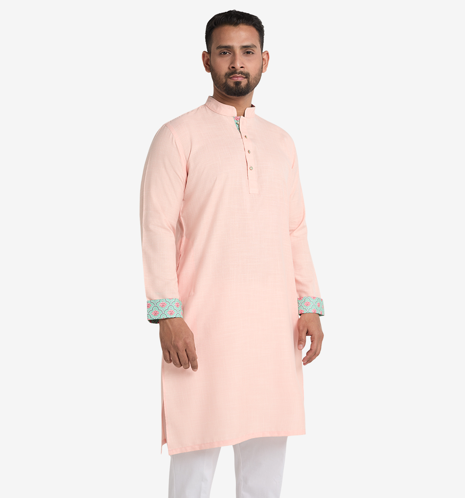 Color: Flamingo Pink Pattern Type: Subtle textured Details: Complementing lotus digital print accent on cuff, inside placket, inside collar. Matching teal green metal buttons Fabri…