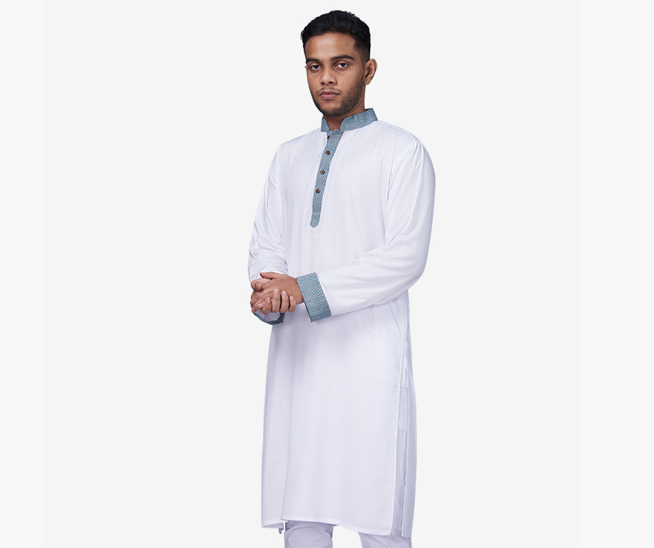 A classic white panjabi with a contemporary twist. Made of soft cotton-viscose fabric with contrast green geometric print on the collar and cuff. Finished off with coconut buttons.…