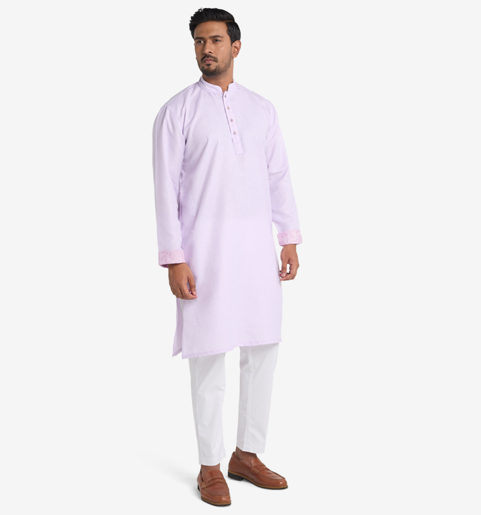 Step into the serenity of lilac, where sophistication intertwines with charm in a delightful fusion of texture and hues. This panjabi encapsulates the essence of spring with its in…
