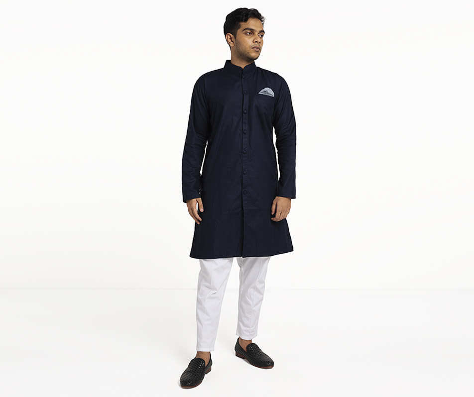 A classic reimagined, the Navy Sherwani comes in a regular fit with a higher mandarin collar, full button down and a perfectly paired pocket square for an added flare of fashion.