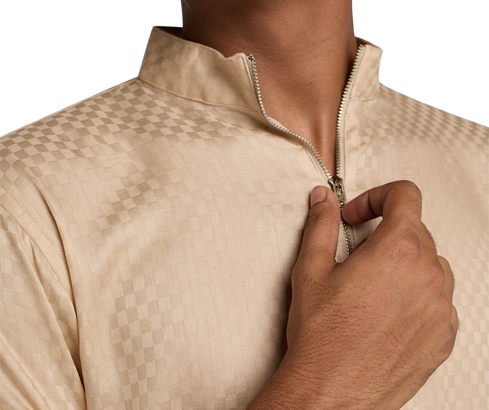 A fashion-forward and contemporary piece designed to elevate your style. This panjabi showcases a timeless nobleman beige, highlighted with a golden zip-up front and zippered cuffs…