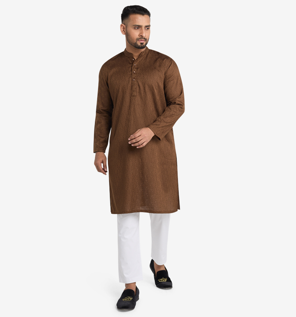 Indulge in the rich allure of Nutshell Brown with the MAHAL Nutshell Brown Jacquard Floral Panjabi. This captivating hue adds a touch of sophistication to your festive outfit, seam…