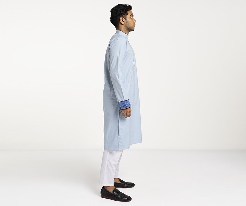 The Panjabi reimagined with this beau-blue solid tone body with an ocean inspired lace embroidery contrast and matching navy zipper feature.