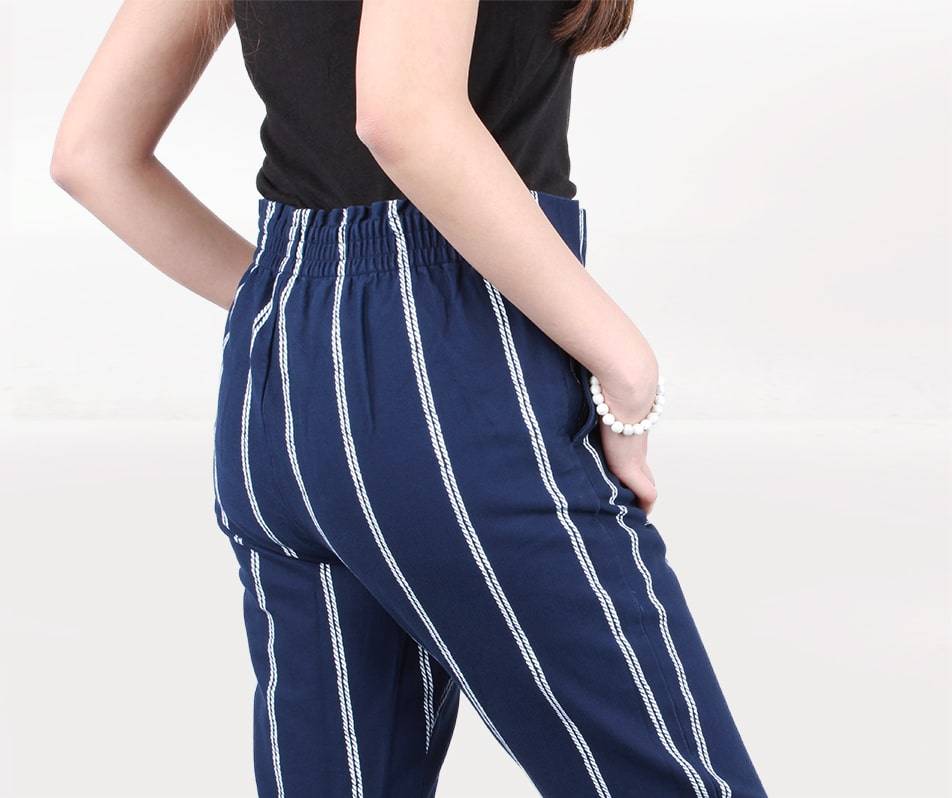 Patterned trousers are the ultimate way to make a statement. These high-waisted trousers come in a rich cotton-stretch fabrication with an all-over rope-y stripes. Pair with any t-…