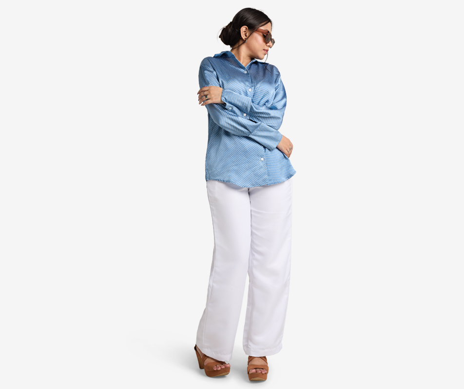 Product Description: The Polka Dot Relaxed Fit Silk Shirt in a distinctive Carolina blue hue effortlessly blends elegance with a relaxed vibe. Its flowing design, coupled with a su…