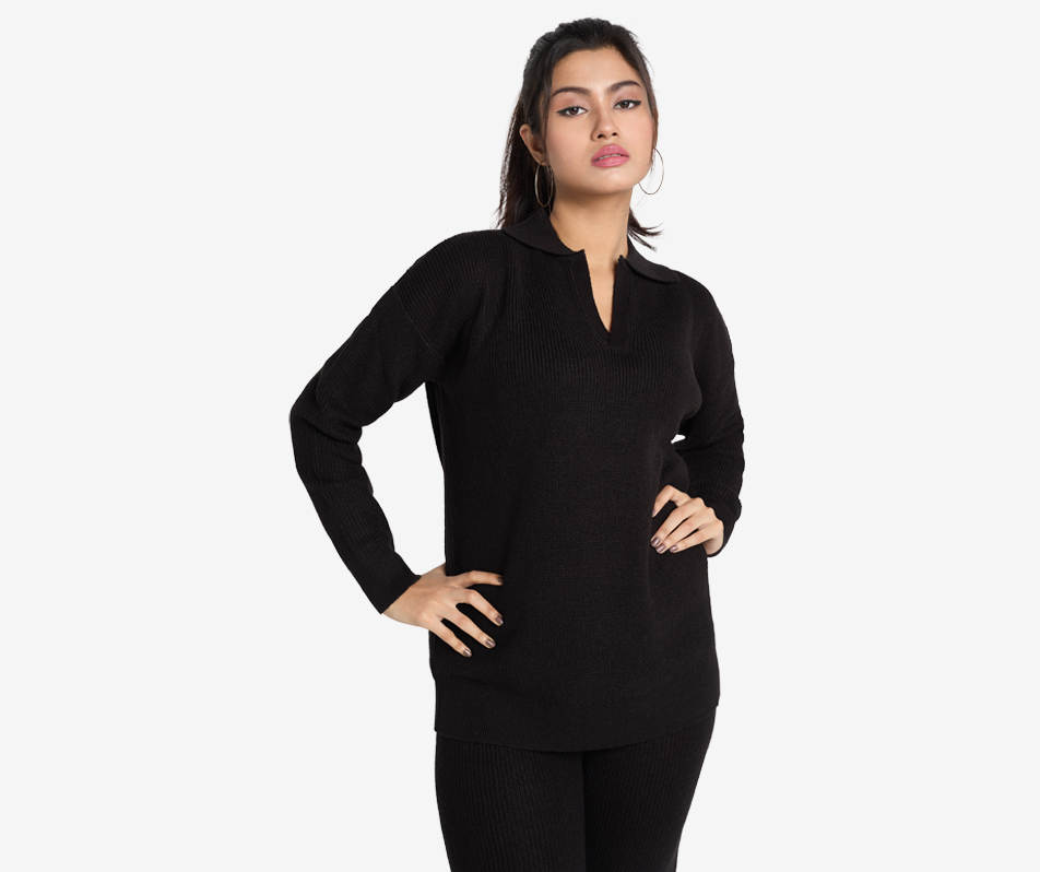 Details: Collared, v-neck, seamless cuffed hem and sleeve
