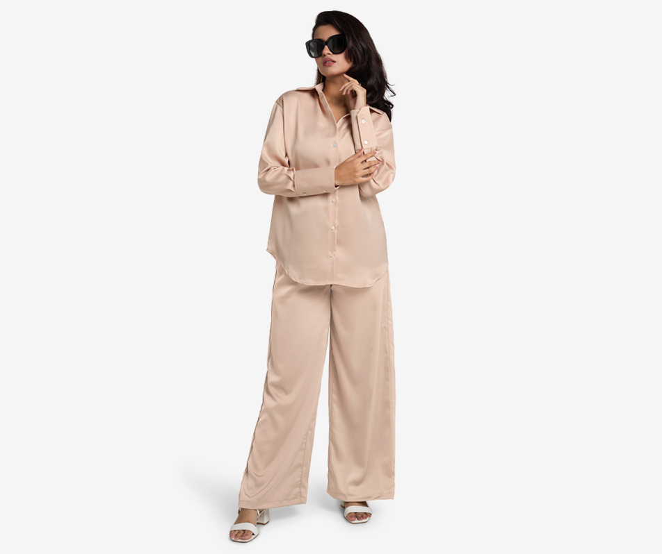 Product Description: Embrace effortless elegance with the Nude Pink Matte Satin Oversized Shirt, the cornerstone of a chic co-ord. Boasting a premium lustrous matte satin and a rel…
