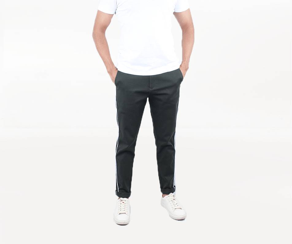 Upgrade your style with these sporty yet sleek looking trousers w/ contrast side tape. The fabric is a dark green textured fabric made of cotton spandex to ensure you’re comf…