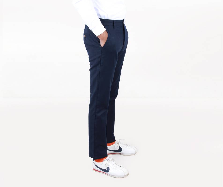 A slim fit navy silhouette made of premium cotton spandex for all day comfort. A must-have in any man's wardrobe. Model is wearing W32 height 6' 0", 183 cm Available in Black, Khak…