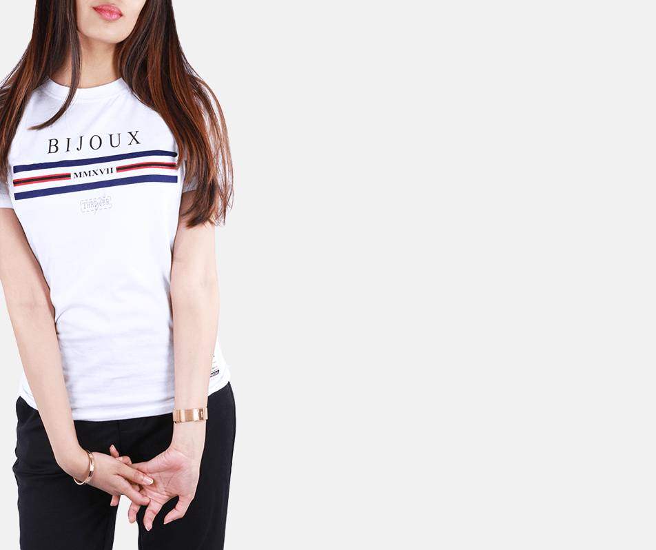 A bold and trendy piece for a contemporary look. This designer influenced white tee with a multi stripe print across the chest is a wardrobe essential for summer. Grab this tee to …