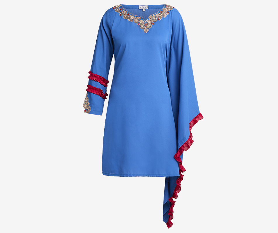 A blue georgette, kaftan piece with red muslin frill work and sleeve trim. Hand embroidered with zari kat chuppi detail around the neckline and body. Fabric- georgette