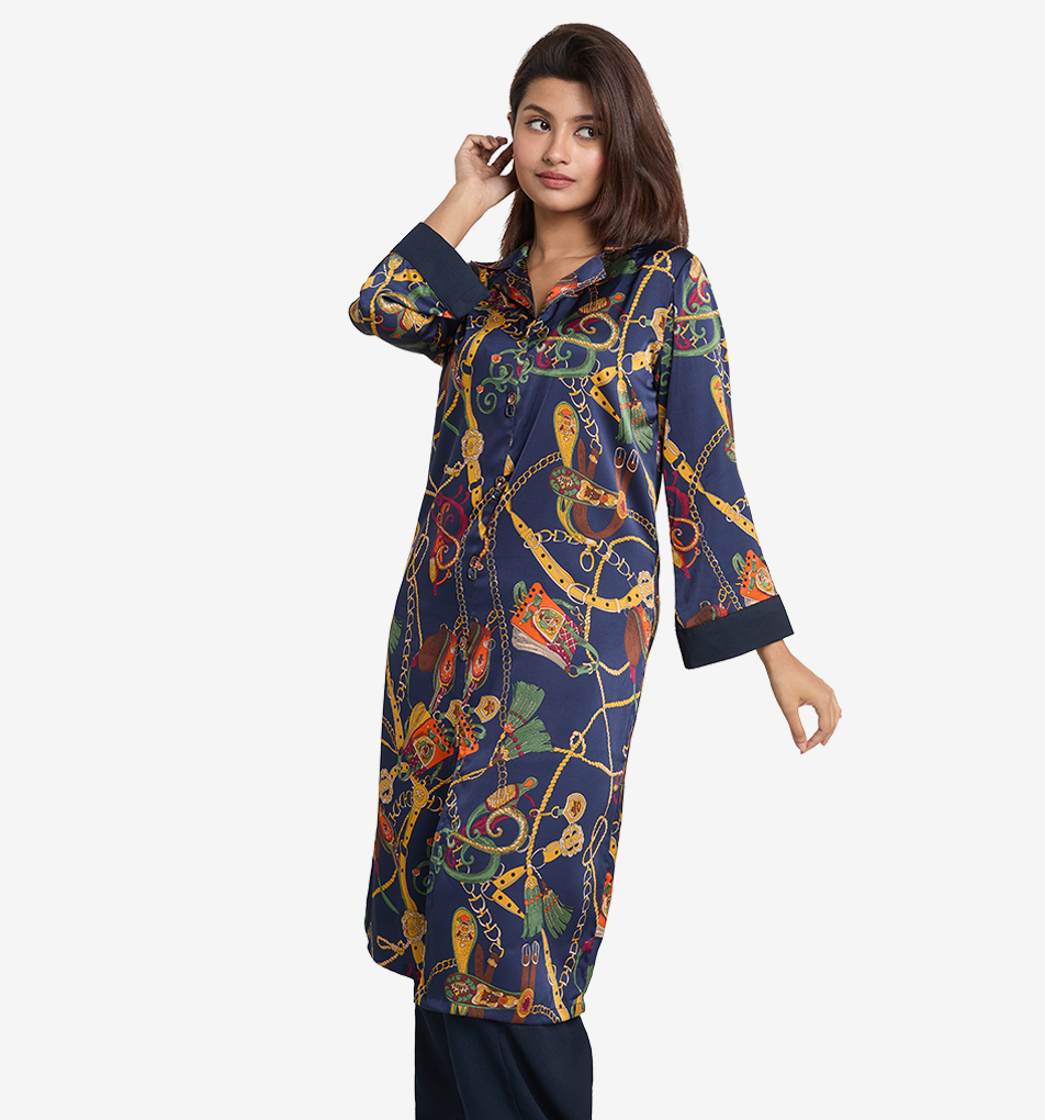 Description: The MAHAL Navy Printed Silk Longline Tunic showcases a chain print in navy, accented with green, yellow, and brown hues. Crafted from a luxurious silk blend, this tuni…
