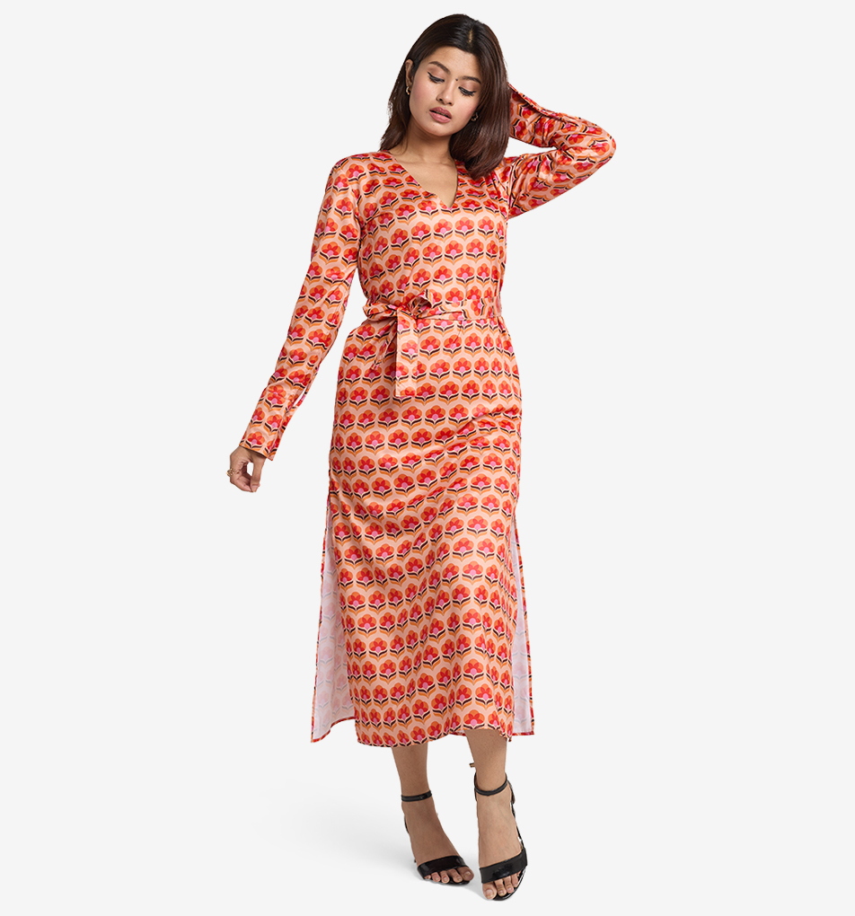 Description: The MAHAL Peachy Pop Retro Midi Dress in peach and red boasts a vibrant floral pattern with an original digital print. Crafted from a cotton-polyester blend, it offers…