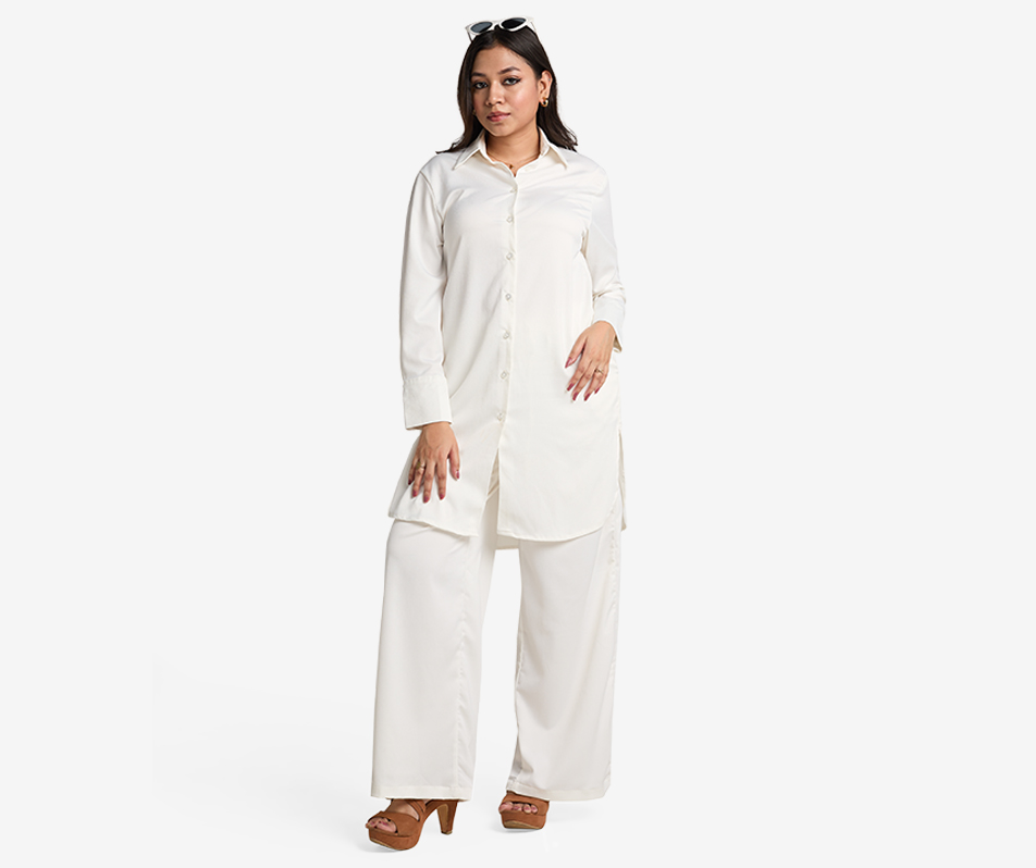 Embrace effortless elegance with the White Textured Long Line Matte Satin Shirt (Co-ord), the cornerstone of a chic co-ord. Boasting a premium lustrous matte satin and a relaxed fi…
